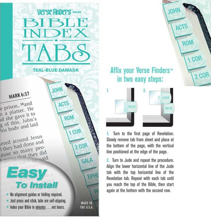 $5.78Bible Indexing Tabs Gold Edged 80 Pcs Tabbies(R) Bible Indexing Tabs are the best selling tab for THE best seller! Tab any size Bible with these pre-cut, self-adhesive tabs. Permanent adhesive; won’t fall off. Tabs are printed on both sides for easy reading and quick reference. Easy-to-follow instructions and Tab Positioning Guide included in each package.